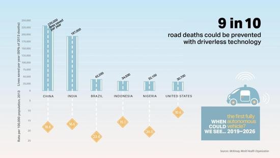 业内专家认为,改用无人驾驶车辆可以消除这些交通事故,从而防止90%的交通事故死亡。利用2013年的数据作为基准,这意味着每年挽救110万人的生命。这将相当于在公共卫生领域进行一场关于反吸烟倡议或疫苗接种的革命。