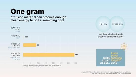 相比之下,聚变反应是安全的,几乎不会产生放射性废物。后者产生的主要废物氦是一种无毒气体,而且可被用于派对气球、大型强子对撞机上。此外,核聚变燃料更容易找到,氘在海水中含量丰富,而氚可以用锂来制造。在聚变反应中,这些燃料每克产生的能量是铀裂变的4倍,是燃烧煤炭的1130万倍。1克聚变燃料就能产生足够的热量,可以让游泳池沸腾。
