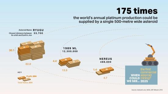 加州理工学院在2012年的一项研究中估计,捕获重达500吨、直径7米宽的近地小行星、并将其带回月球轨道的成本约为26亿美元。这是一大笔钱,甚至是个让人难以想象的数目。而潜在的回报也是天文数字。根据麻省理工学院的2016项目计划估计,一颗直径500米、富含铂的小行星可以提供相当于全球当前产量175倍的白金,甚至超过全世界铂类金属的总储量。
