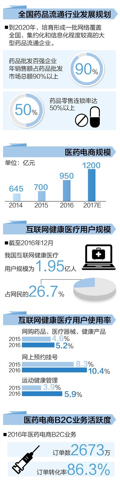 2017年初,国务院办公厅发布《关于进一步改革完善药品生产流通使用政策的若干意见》,要求引导“互联网+药品流通”规范发展,支持药品流通企业与互联网企业加强合作,推进线上线下融合发展,培育新兴业态。规范零售药店互联网零售服务,推广“网订店取”“网订店送”等新型配送方式。