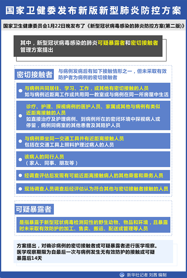 新华社北京1月23日电(记者田晓航、王秉阳)国家卫生健康委员会22日晚发布了《新型冠状病毒感染的肺炎防控方案(第二版)》。方案提到,基于目前对新型冠状病毒感染的肺炎的认识,疾病的潜伏期最长约为14天,病例存在人传人情况,参照SARS和MERS的防控经验判断,潜伏期可能无传染性。
