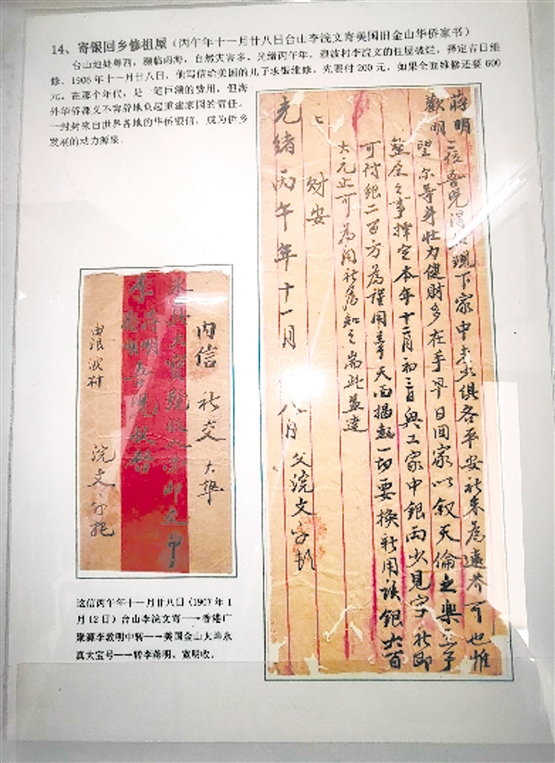 除了照顾长辈,对于后辈,华侨也十分关心。在三益银信博物馆,展出着一封标注“要信”的礼银。这是当时身在美国罗省的邝文献从家人来信中得知,家乡中的后辈亚浓即将成亲,他马上联系在旧金山的女婿李宽明,一同筹备好礼银寄回家里,让亚浓办喜事。这是身在海外的长辈对后辈的祝福与担当。